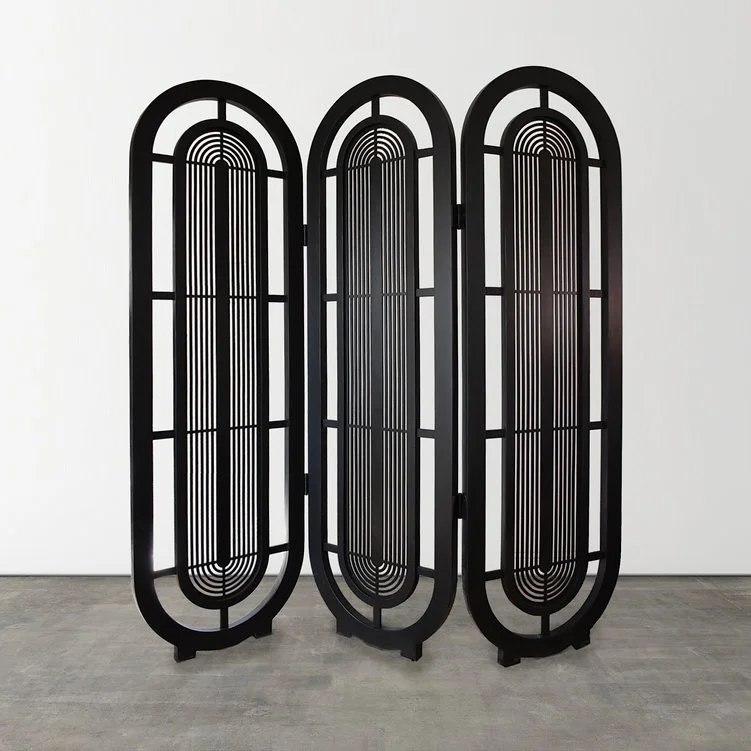 This tri-fold screen is inspired by the classical architectural designs of Southern California. Horizontal outlines create a new dimension as an optical illusion of space behind the screen. The curved panels allow this screen to act as a wall, or stand beautifully on its own as a decor piece.