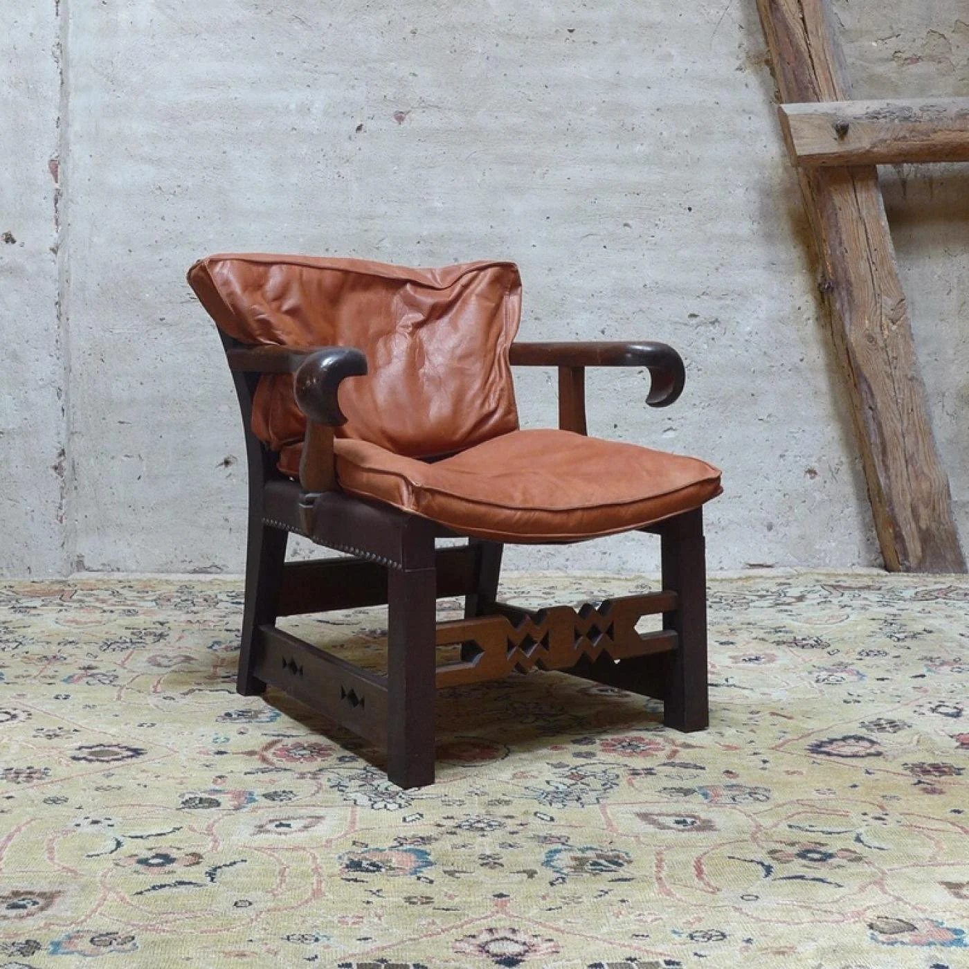 A sculpted Expressionist lounge chair by Oskar Strnad. Of carved mahogany and leather. A similar version of this chair was exhibited at the Cologne Werkbund exhibition in 1914.