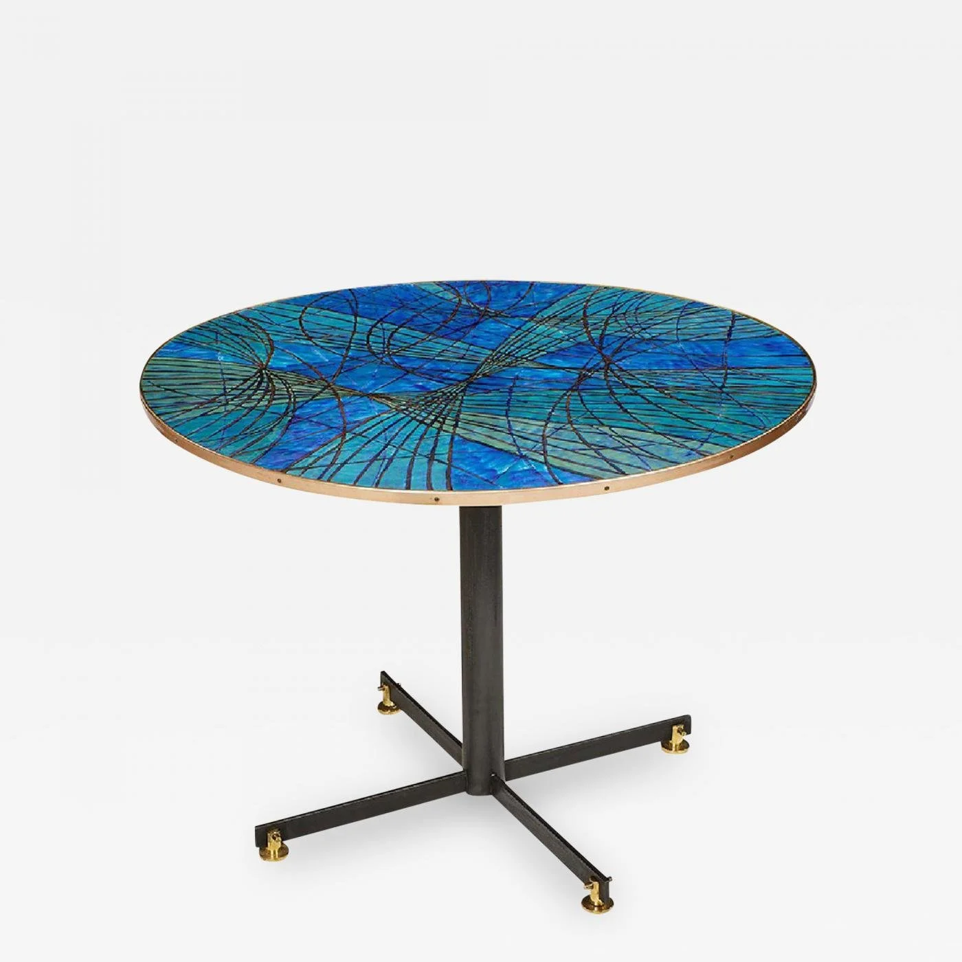 An enameled copper dining table by Siva Arredamenti / SIVA Poggibonsi. This unique table has an low fired enamel copper top by Limoges in shades of blue and green with a powder coated black steel base and polished brass feet.